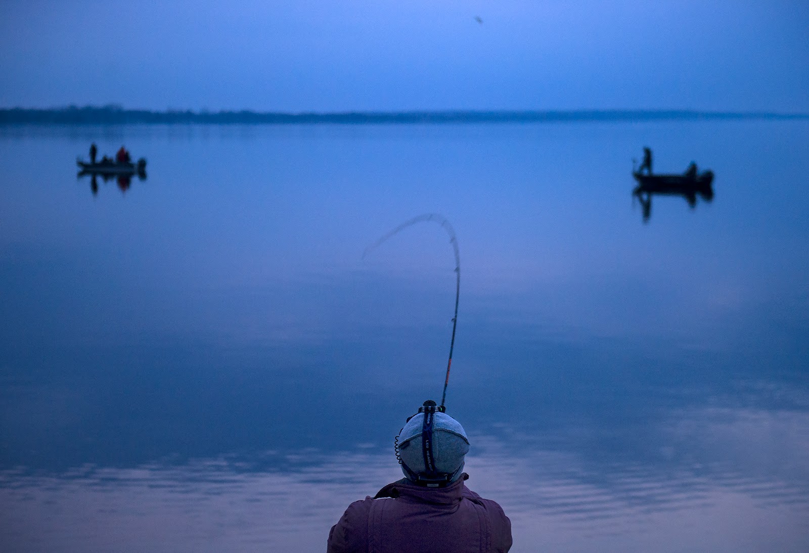BELLEVILLE, Ont. (03/12/17) — Robert Li casts his bait into the Bay of Quinte in Zwick’s Park in Belleville, Ont. on the evening of Dec. 3, 2017. He and his friends gathered to fish for Walleye at night. Li explained that the fish see in the dark and hide during the day. They are very slow fish and it sometimes can take hours before they catch anything. Photo by Andrej Ivanov